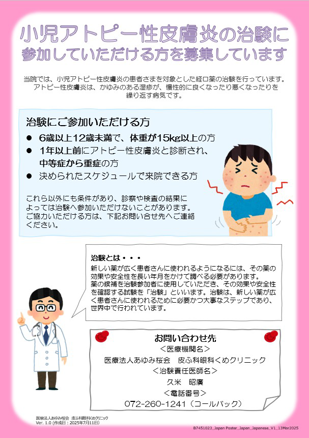 小児アトピー性皮膚炎の治験参加者募集中♥️