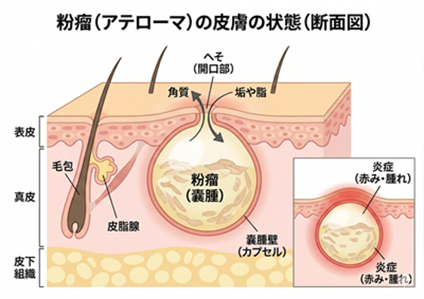 アテローム(アテローマ、表皮嚢腫)は、皮膚の下にできる良性の嚢胞で、皮脂腺の分泌物が詰まることによって形成されます。以下にアテロームの主なポイントを説明します。