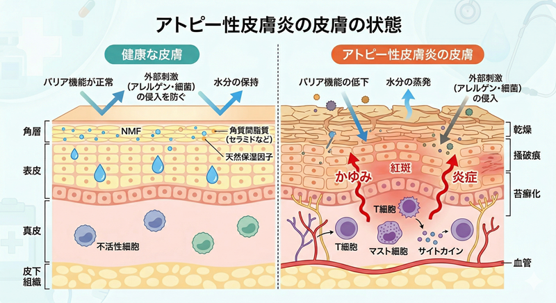 1. 遺伝的要因: アトピー性皮膚炎は家族歴があることが多く、遺伝的要因が関与しています。「掻くことでさらにバリア機能が破壊され、炎症が悪化する」という悪循環(イッチ・スクラッチ・サイクル)を形成します。