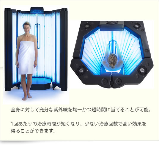 PUVA療法の代替従来のPUVA療法で必要とされていた光増感剤(ソラレン)の内服や外用が不要です。これにより、光増感剤による副作用の心配がありません。