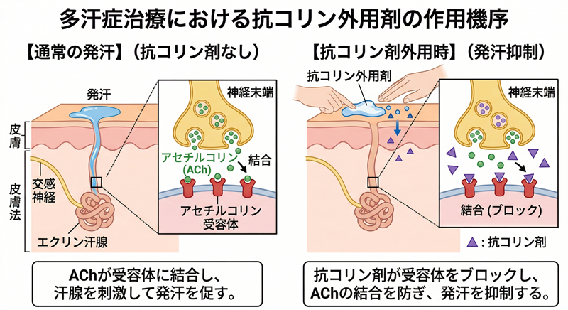 - 外用薬: ワキ、手掌には抗コリン作用を持つ、外用剤が保険適応で認められています。ほどんどの場合、この治療法で改善します。