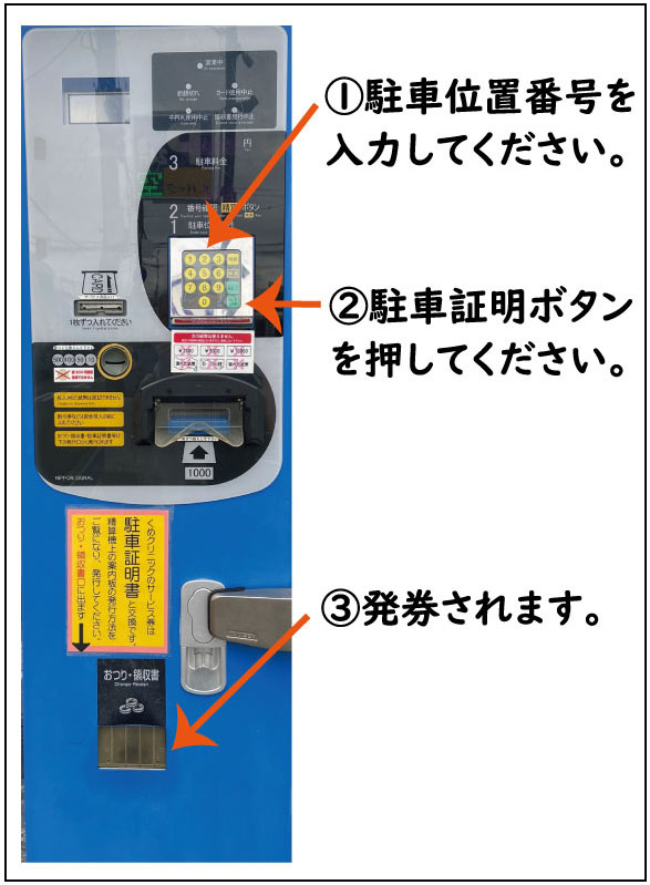 万が一、駐車証明書が出ない時は、駐車番号を受付時にお申し出ください。(確認いたします)
